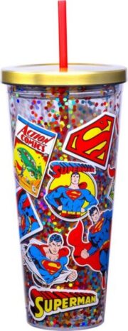 Superman Thru the Years Images & Logo 32 oz Glitter Travel Cup with Straw UNUSED