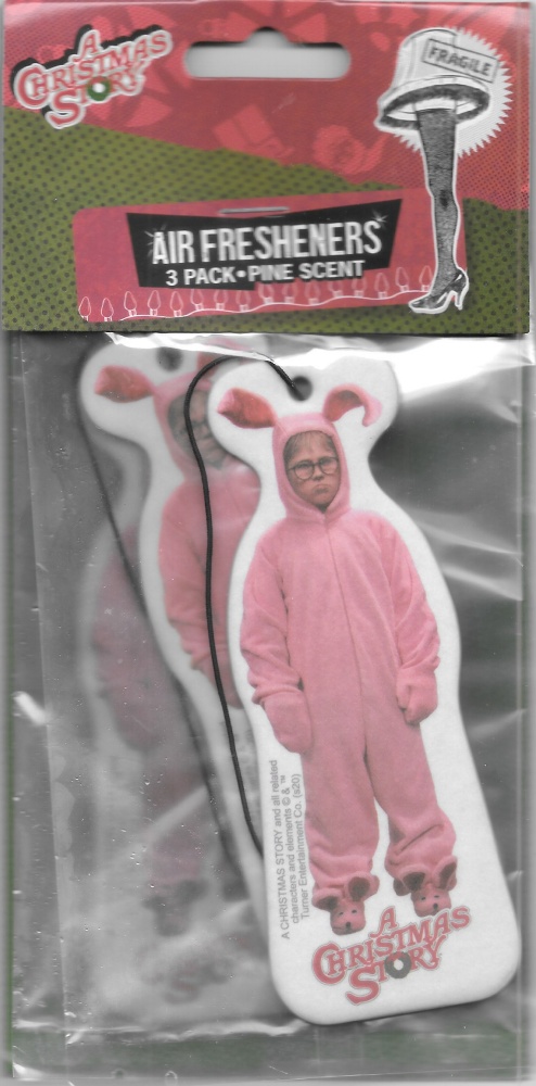 This is a set of three (3) illustrated pine scent air fresheners featuring an image of Ralphie wearing the pink rabbit costume from the classic comedy holiday movie A Christmas Story. Measuring 4.75″ x 1.75″ these are new and unused sealed air fresheners stored in a smoke and pet free environment.