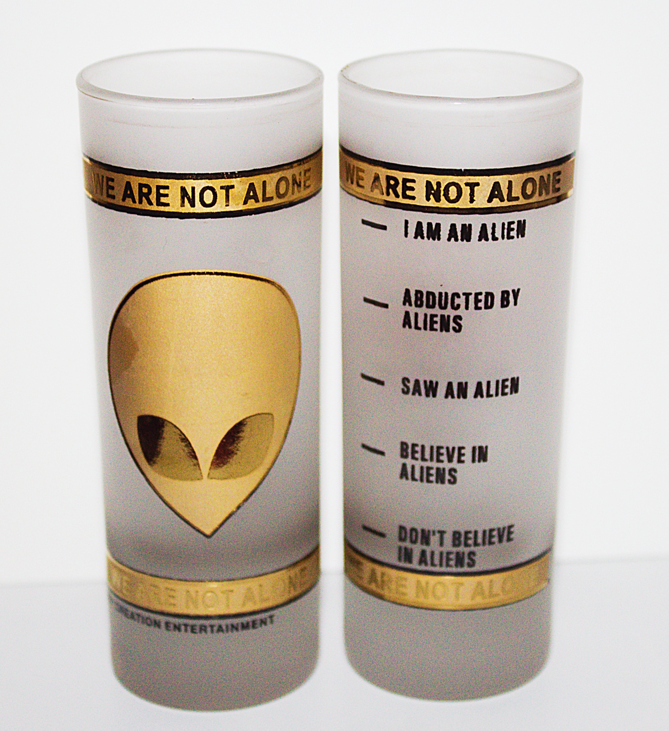 Produced in 1987 by Creation Entertainment, this is a new, never used smoke shooter glass, depicting the common image of a UFO alien in gold surrounded by the words “We Are Not Alone” also in gold on the front. On the back is a measurement scale to test your sobriety after drinking. This item is no longer being made and is stored in a smoke and pet free environment.