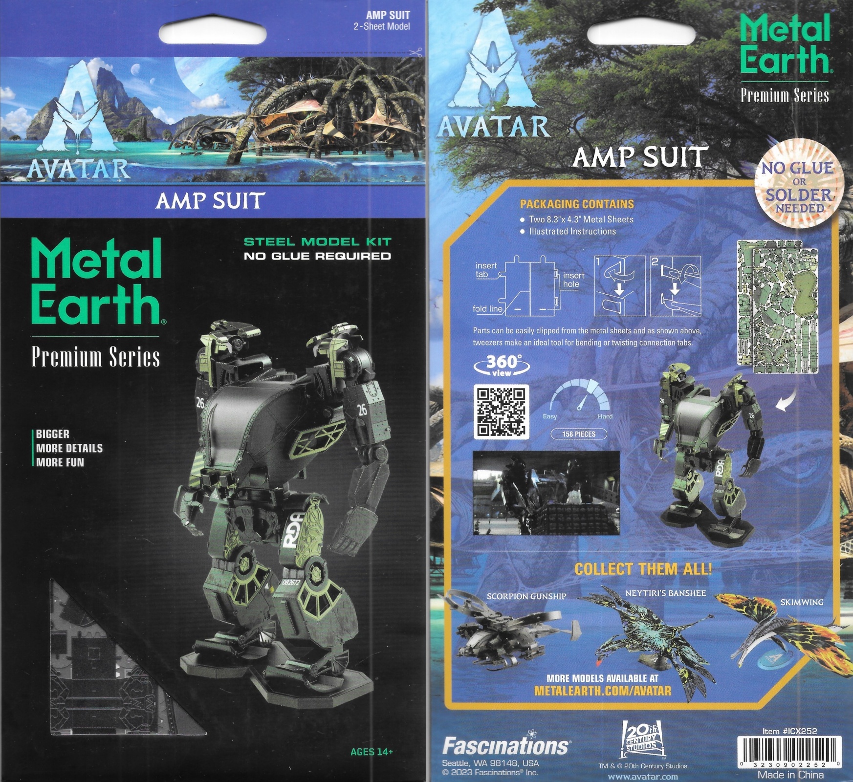This amazingly detailed model starts as two 8.3″ x 4.3″ metal sheets and finishes as a 3-D model. It is approximately 3.3″ L x 2″ W x 4.5″ H when assembled and this one features the Amp Suit, from the popular Avatar movies. The Mitsubishi MK-6 Amplified Mobility Platform (or “AMP” suit) is a distant descendant of the first military exoskeletons used on Earth in the mid-21st century. The sheets contains detailed laser etching for easy removal. Complete instructions are included to show you how to pop out the pieces, bend the tabs, and connect them at the attachment points. This kit is considered moderate with an average assembly time of 45-60 minutes. It has been stored in a smoke and pet free environment. We also offer an optional LED base or a Solar Spinner for better display of your model.