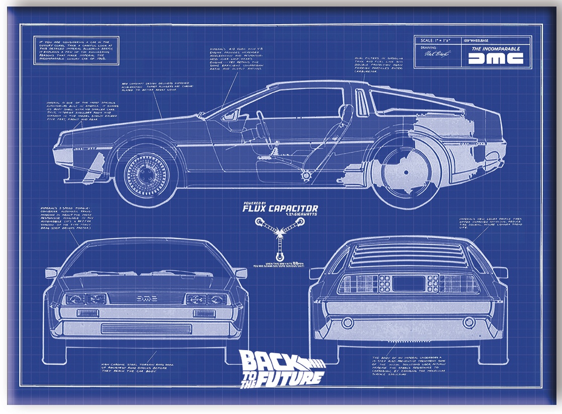 Back to the Future DeLorean and Flux Capacitor Blueprint Refrigerator Magnet NEW