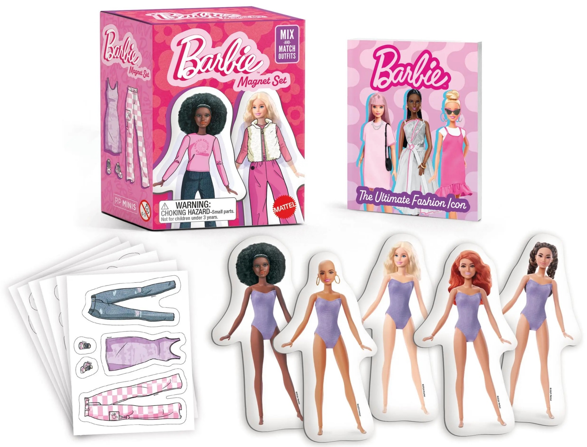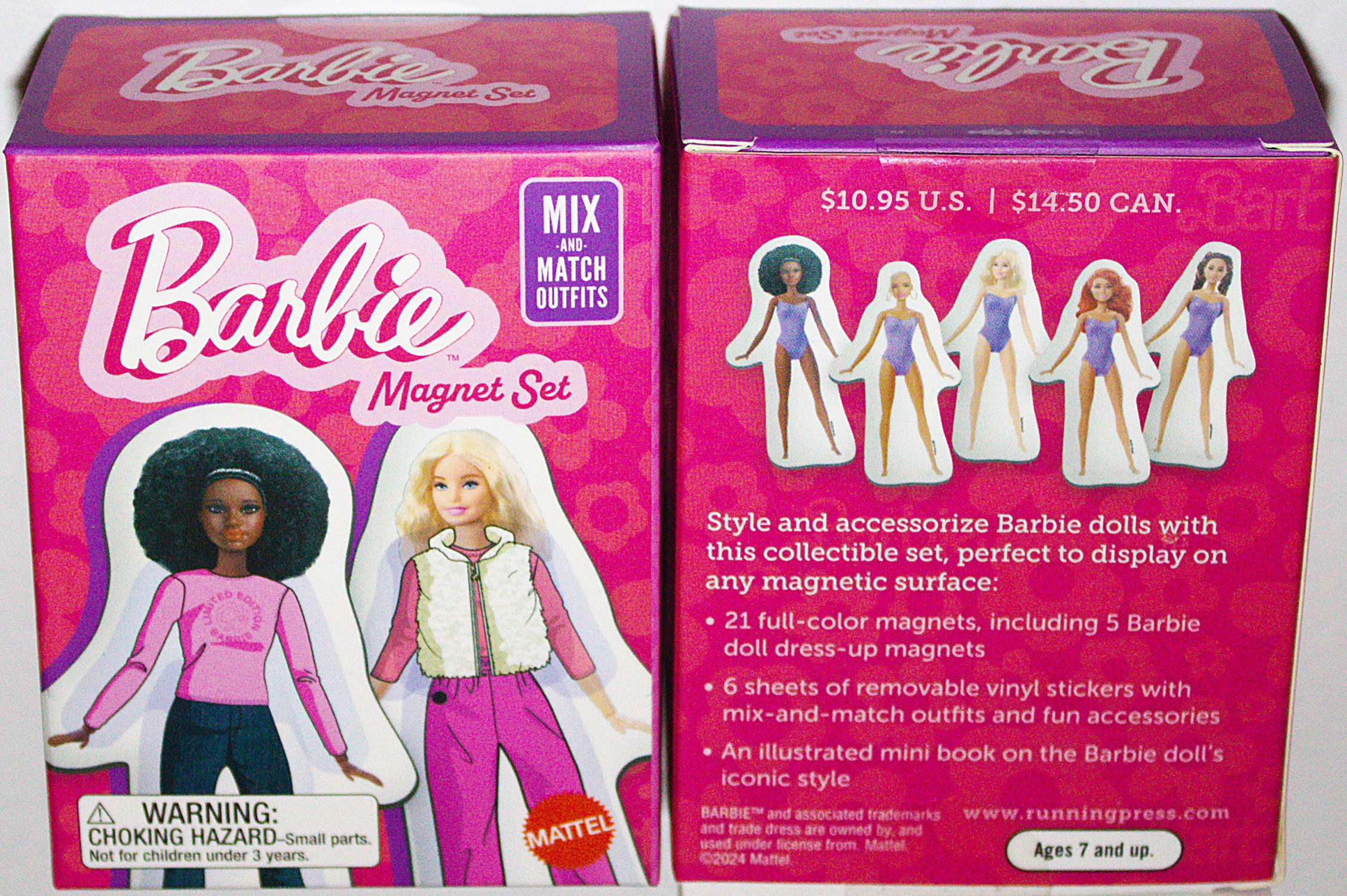 Be a Barbie stylist with this mix-and-match magnet set, perfect to display on any magnetic surface. It includes 21 full-color magnets including five Barbie dolls, and 7 sheets of mix-and-match outfit removable stickers, various fun accessories, and more. There is also a 32-page mini guide to the iconic Barbie style. A must-have set for fans of Barbie. The small size allows for fun anytime, anywhere, on any magnetic surface. This is a new, sealed copy that we purchased direct from the publisher and it has been stored in a smoke and pet free environment.