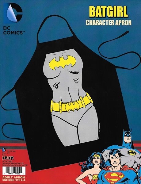 This is a black, white, blue and yellow polyester adult apron featuring the body image of DC Comics superhero Batgirl on the front. This is a new, unworn apron still in its original packaging stored in a smoke and pet free environment.