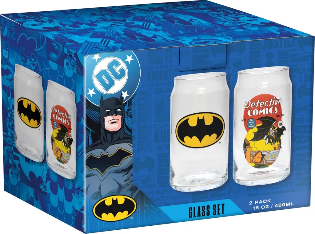 This is a new, unused set of two clear 16 ounce glasses featuring the cover of Detecive Comics #27 (Batman’s first appearance) on one and Batman’s bat chest logo on the other. They come in an illustrated box and are stored in a smoke and pet free environment.