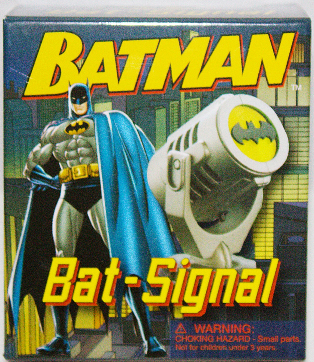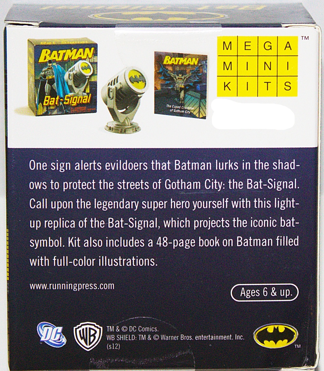 A one-of-a-kind, officially licensed, light-up miniature replica of Batman’s Bat-Signal. This is a finally detailed 2.75 inch high Bat-Signal that lights up and projects the iconic Batman symbol onto nearby walls and other surfaces. This set also includes a 48-page mini book that explores Batman’s history with full-color classic comic art throughout. Requires one 3-volt CR1632 button cell battery (included). This is a new, sealed copy that we purchased direct from the publisher and it has been stored in a smoke and pet free environment.