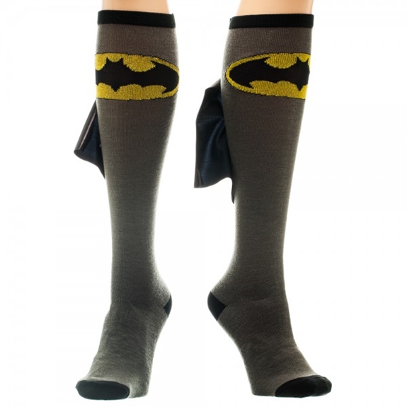 This is a new and unused pair of black and yellow knee high derby style socks featuring the familiar chest logo of Batman. Designed for ages 14 and up, they are made of acrylic and polyester and feature a 9 1/2″ long spandex cape on the back and are machine washable. These are like the other pair we sell except that they have a shiny cape. They are stored in a smoke and pet free environment.