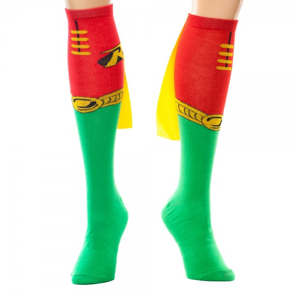 This is a new and unused pair of green, yellow and red knee high derby style socks featuring the familiar costume of Batman’s sidekick Robin the Boy Wonder. Designed for ages 14 and up, they are made of acyylic and polyester and feature a 9 1/2″ long spandex cape on the back and are machine washable. It has been stored in a smoke and pet free environment.