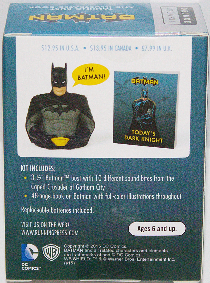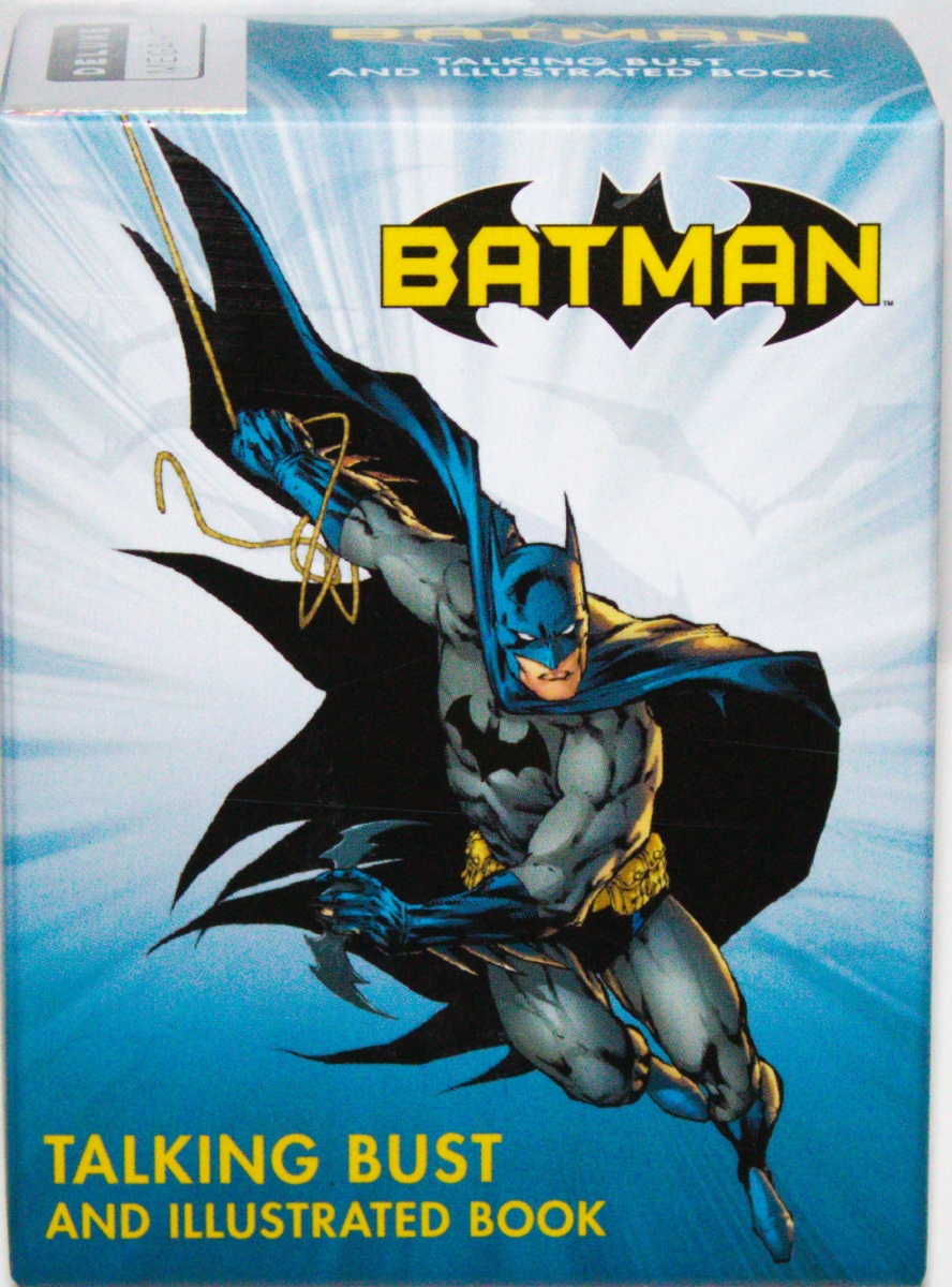 Proclaim “I’m Batman” with this officially licensed, talking collectible bust of the Dark Knight. This is a finely detailed, 3.5 inch Batman bust mounted on a base that features 10 Heroic sound bites. Hear the words that the Dark Knight uses to strike fear into the hearts of Gotham City’s criminals. Also included is a 48-page book exploring the Caped Crusader’s adventures with illustrations straight from the comic pages featuring full-color classic comic art throughout the book. This is a new, sealed copy that we purchased direct from the publisher and it has been stored in a smoke and pet free environment.