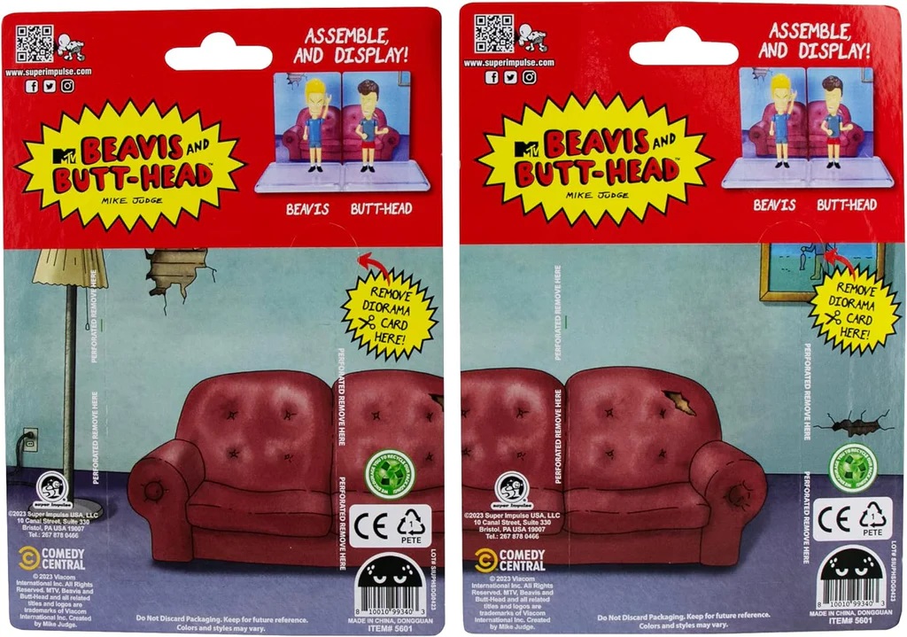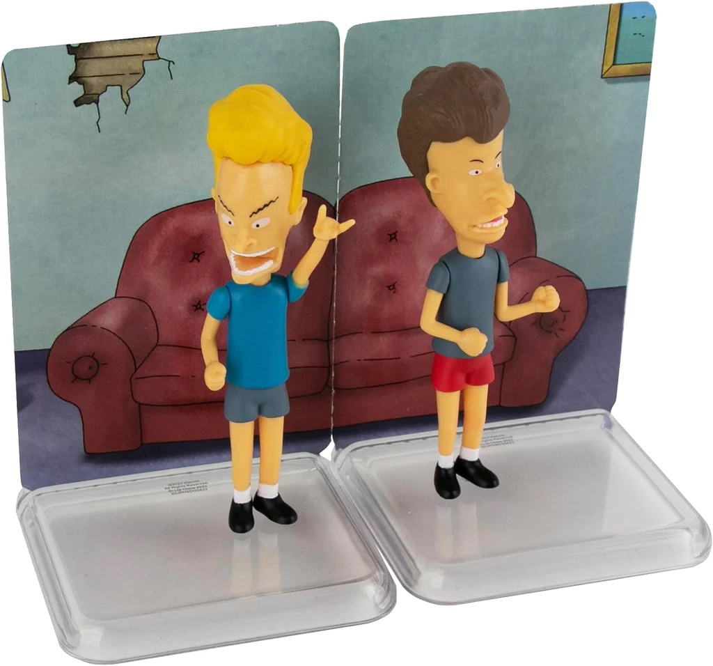 Produced by Super Impulse, this features the main characters from the animated TV series Beavis and Butt-Head. The figures are approximately 3.75″ tall, have movable arms and a turnable head and include a diorama display that attaches to a display base. We pulled these from a sealed case that we bought direct from Super Impulse and they have been stored in a smoke and pet free environment.