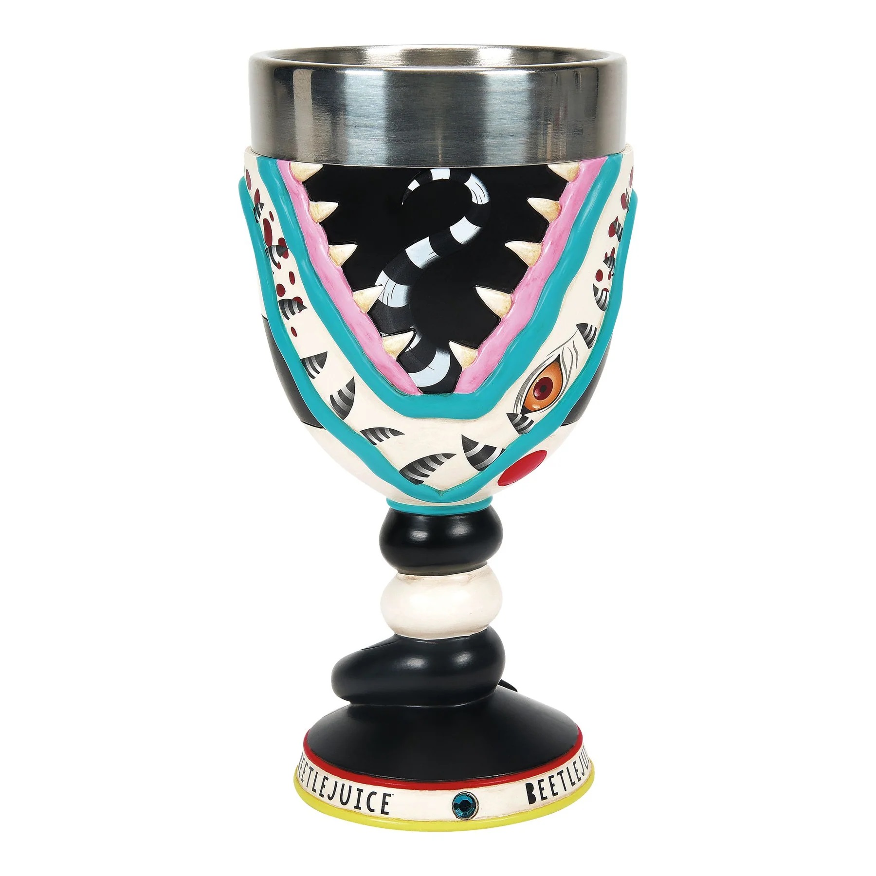 This is a 7″ high sculpted stone resin with stainless steel bowl and lip decorative goblet featuring the Sandworm from the original hit movie Beetlejuice. Substantial hand-crafted gothic-style goblet with a stone-resin outer surface and base with a raised Sandworm image. Not dishwasher safe. Gently clean exterior with dry cloth only. This is a decorative Goblet, not Intended as Drinkware. Hand-wash stainless steel bowl only. It is new and unused and is stored in a smoke and pet free environment.