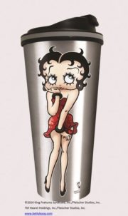 This is an 18 oz stainless steel lid travel cup with straw featuring the classic animated art image of Betty Boop bending over. This is a new, unused, BPA free travel mug stored in a smoke and pet free environment. Hand wash recommended.