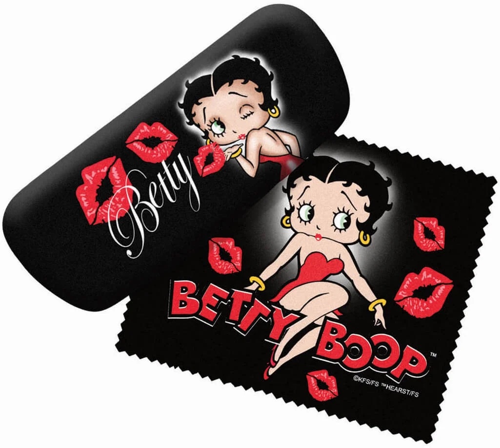This is an illustrated eyeglass case with an image of the animation girl Betty Boop blowing kisses and comes with a matching cleaning cloth that measures approximately 6″ from the famed classic animated cartoons. This is a new, unused eyeglass case stored in a smoke and pet free environment.