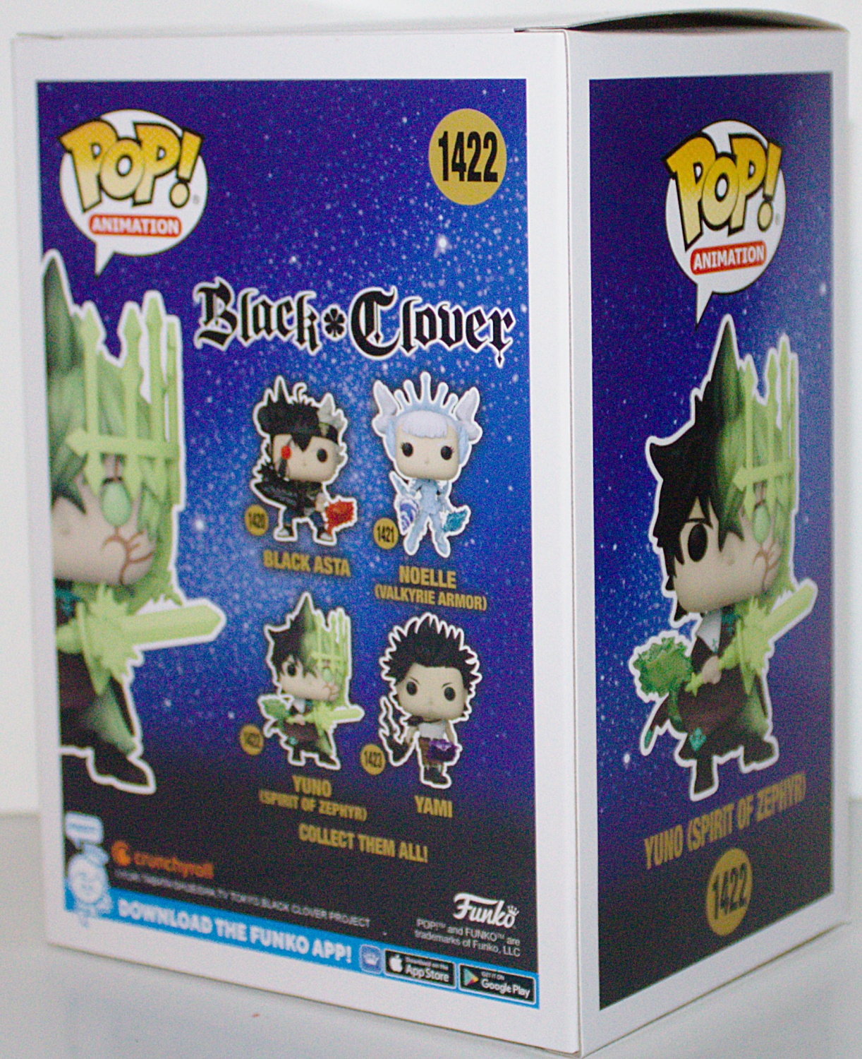 This is part of the FUNKO line of POP vinyl figures and this series features characters from the anime series Black Clover, measuring 3.75″ high. This comes in a sealed illustrated box with a clear plastic front that displays the toy and it stored in a smoke and pet free environment.