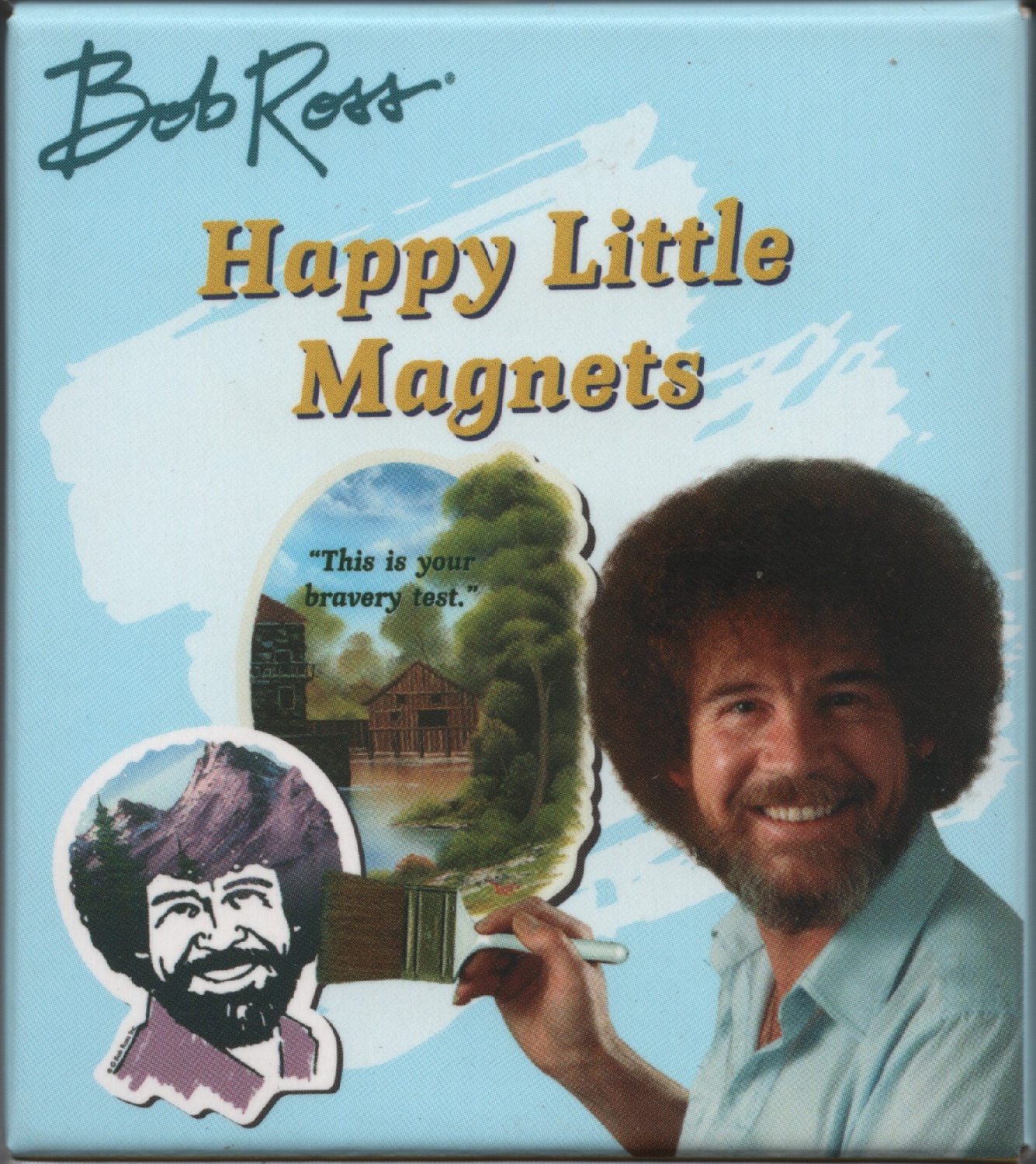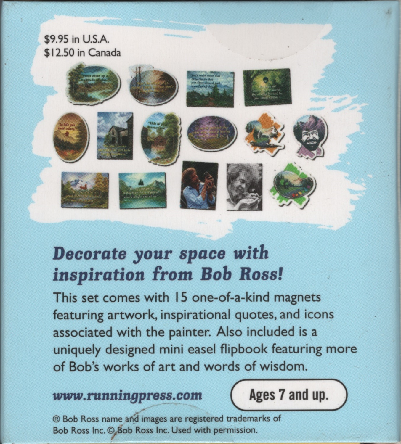 Spread the inspirational artwork and words of wisdom of Bob Ross with this colorful, one-of-a-kind magnet collection. The set includes: Fifteen original magnets featuring Bob Ross artwork, inspirational quotes, and iconic images related to the painter. Also included is a unique easel flipbook featuring Bob’s works of art and words of wisdom that measures 2.5″ x 3″ This is a new, sealed copy that we purchased direct from the publisher and it has been stored in a smoke and pet free environment.