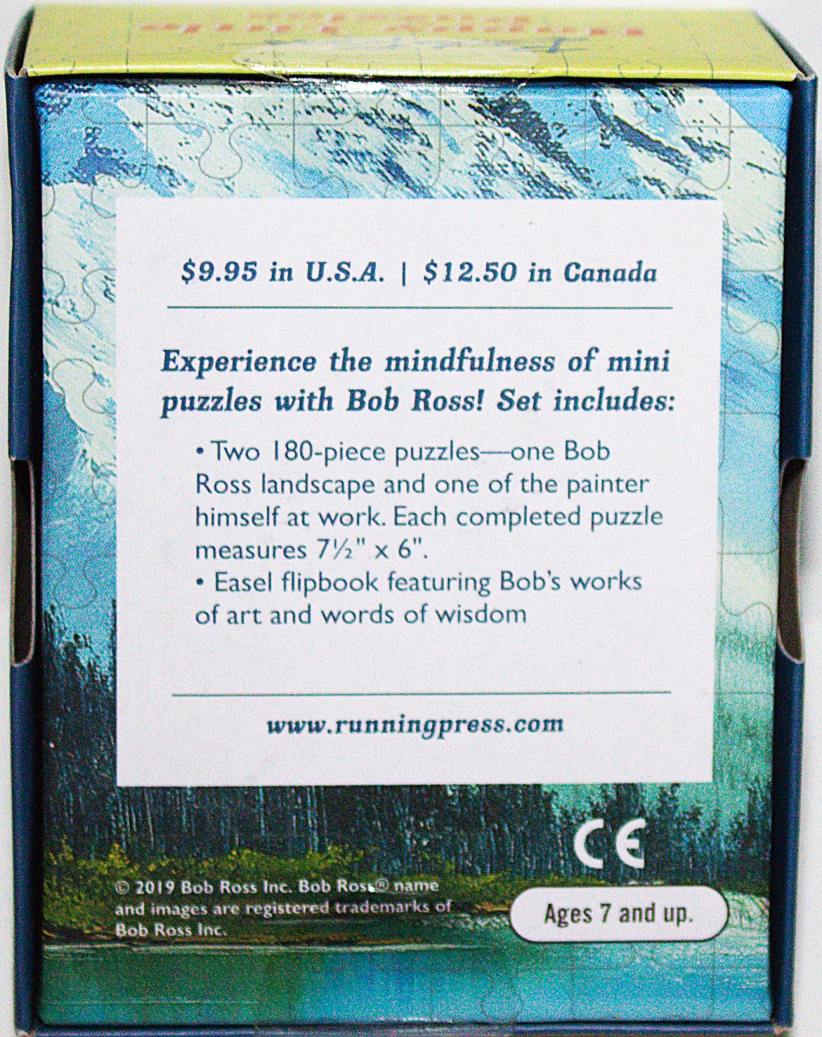 If you love Bob Ross, The Joy of Painting, and mindful pastimes, this mini activity kit is for you! Set includes: 2 distinct 180-piece mini puzzles (one of a landscape painting and one of Bob Ross himself at work). When completed, each puzzle measures 7.5″ x 6″. Plus a 2.5″ x 3″ easel flipbook featuring Bob’s works of art and words of wisdom This is a new, sealed copy that we purchased direct from the publisher and it has been stored in a smoke and pet free environment.
