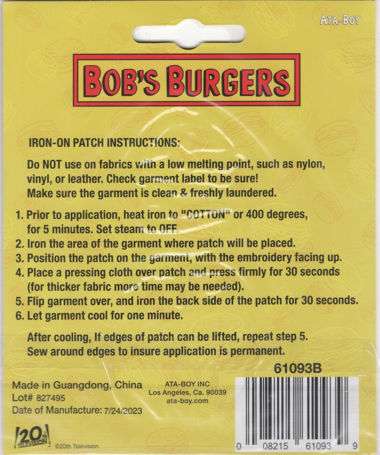 This is a licensed embroidered patch measuring 3.75″ high x 2.5″ wide featuring the logo image of Bob holding a burger from the animated TV Series Bob’s Burgers. This is a new, never used patch that comes with a glue backing for easy application to a cloth surface and is stored in a smoke and pet free environment.