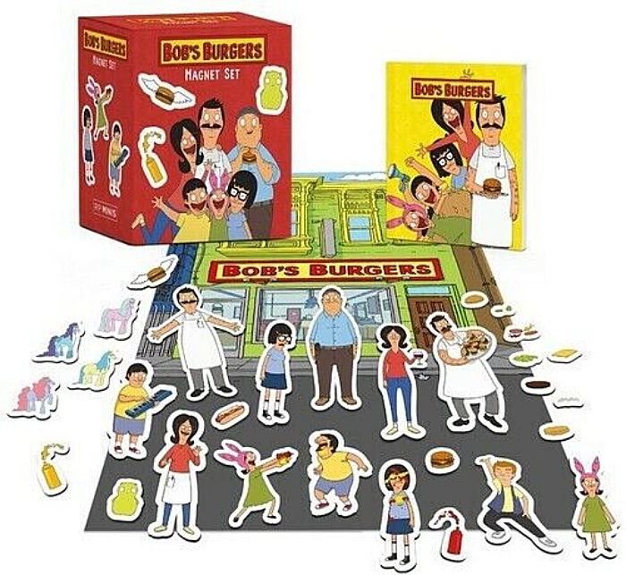 This magnetic set of scenes, characters, and icons allows you to create your own Bob’s Burgers adventures! The kit includes: 25 mini magnets featuring characters and icons from the show along with a two-sided backdrop to build your Bob’s Burgers scenes—at the restaurant and on the street outside. In addition you get a fully illustrated mini book on Bob’s Burgers and its famed restaurant. This is a new, sealed copy that we purchased direct from the publisher and it has been stored in a smoke and pet free environment.