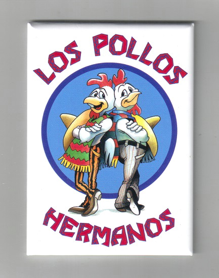 Produced in 2012, this is a licensed, large 2 1/2″ x 3 1/2″ magnet featuring the image of the logo for “Los Pollos Hermanos” (The Chicken Brothers) restaurant from the cult hit TV series Breaking Bad. This is a new, unused magnet that has been stored in a smoke and pet free environment.