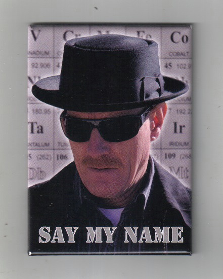 Produced in 2013, this is a licensed, large 2 1/2″ x 3 1/2″ magnet featuring the photo image of Walter White above the phrase “Say My Name” from the cult hit TV series Breaking Bad. This is a new, unused magnet that has been stored in a smoke and pet free environment.