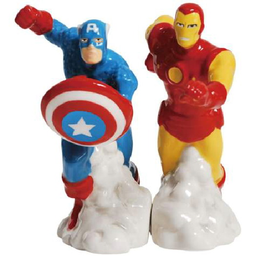 This is a 4″ tall set of ceramic salt and pepper shakers in the image of Marvel Comics Avengers super heroes Captain America and the Iron Man running with each other. It is new and unused, held together by embedded magnets and ships in an illustrated box. It has been stored in a smoke and pet free environment.