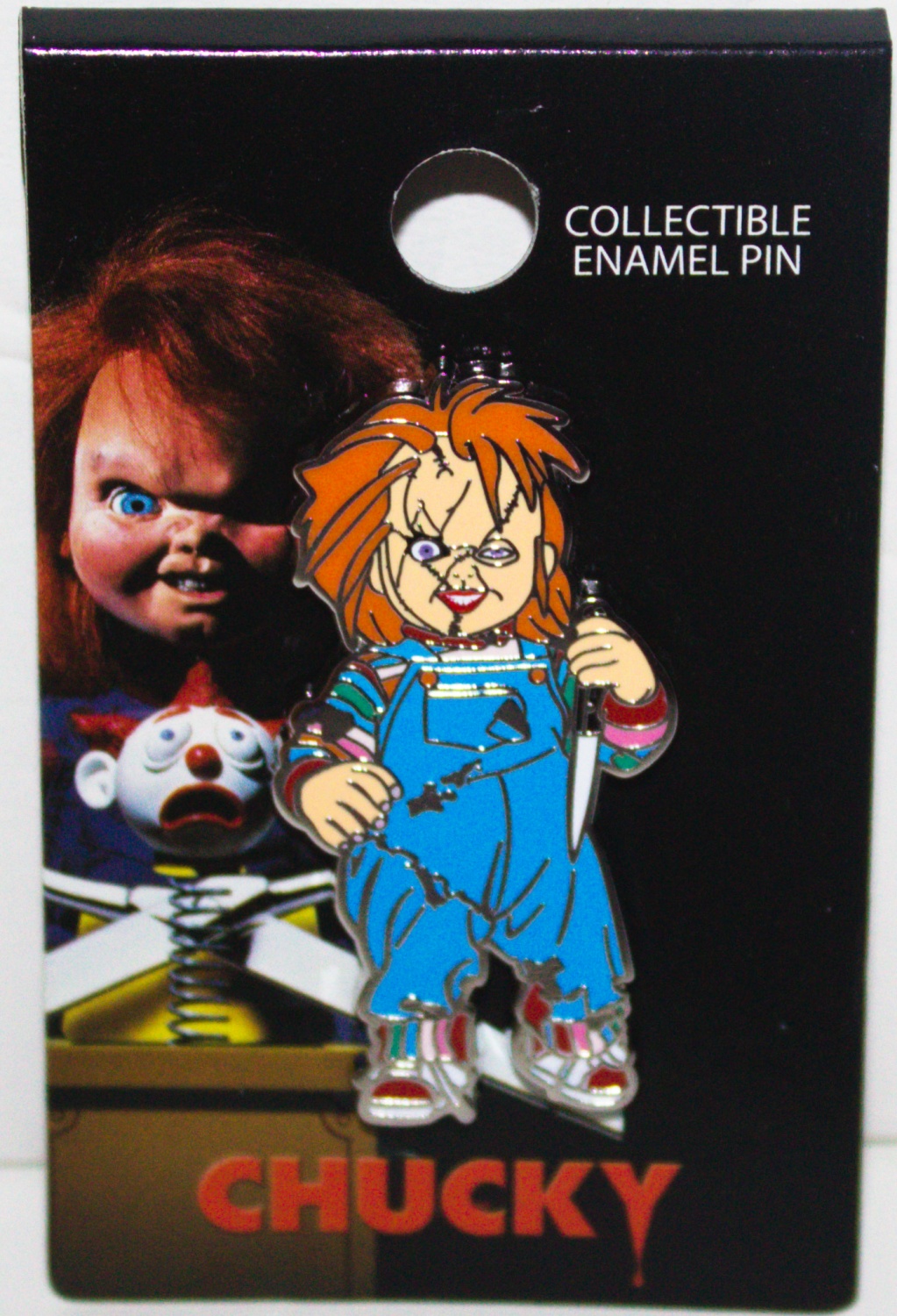 This is a 1.75″ high new and unused metal enamel pin which features the figure of Chucky standing and holding a knife from the “Child’s Play” movies. This is a new, unused pin that is stored in a smoke and pet free environment.