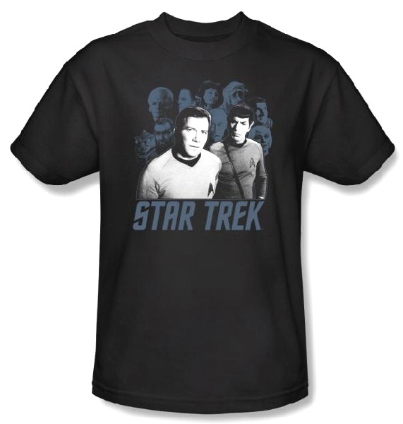 This is a black t-shirt bearing the image Kirk and Spock above the Star Trek name logo, with various aliens races they encountered behind them from the classic original Star Trek TV series. This is a 100% cotton design, new, never worn shirt. It has been stored in a smoke and pet free environment.