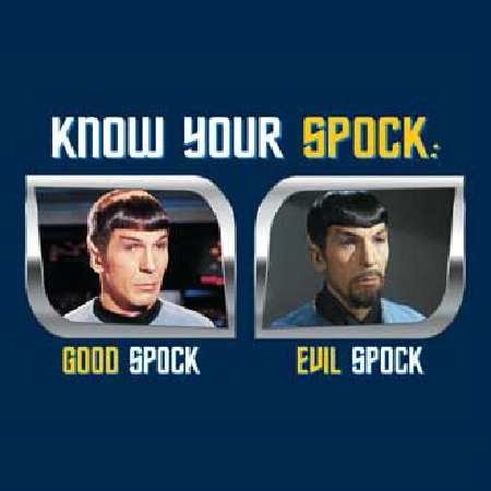 This is a navy blue t-shirt bearing the face of Spock, from the original classic Star Trek TV series, on the left, and his Mirror Universe counterpart on the right. Above them is the phrase “Know Your Spock” and beneath “Good Spock” and “Evil Spock”. This is a 100% cotton design, new, never worn shirt. It has been stored in a smoke and pet free environment.