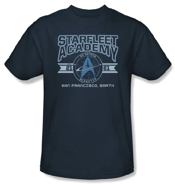 This is a navy blue t-shirt bearing the Starfleet Academy name above a classic Command logo and San Francisco, Earth with Est. 2161 on the edges, from the classic original Star Trek TV series. This is a 100% cotton design, new, never worn shirt. It has been stored in a smoke and pet free environment.