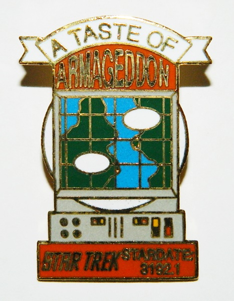 This pin features an image from the 23rd aired Classic Star Trek episode “A Taste of Armageddon”. It measures 1″ high and is a new, unused, mint condition cloisonne metal pin made by the Hollywood Pins Company in 1991. It has had limited release and is not easily found outside of Star Trek conventions. Hollywood Pins closed down in October 2001 so this pin is next to impossible to find.
