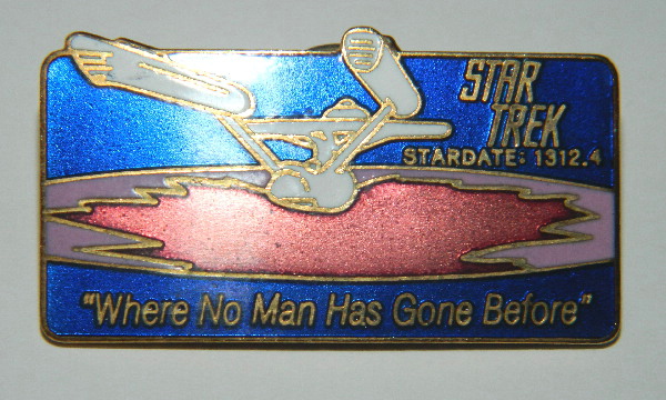 This pin features an image from the third aired Classic Star Trek episode “Where No Man Has Gone Before”, which was also the second filmed pilot. It measures 1.625″ long and is a new, unused, mint condition pin made by the Hollywood Pins Company in 1990. It has had limited release and is not easily found outside of Star Trek conventions. Hollywood Pins closed down in October 2001 so this pin is next to impossible to find.