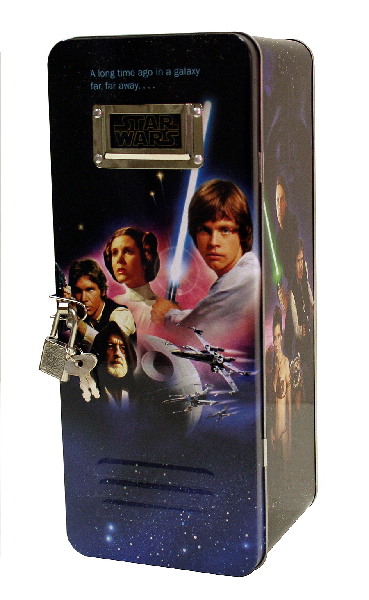 Produced in 2011, this is a 4″ x 4″ x 10″ high metal locker tin in the shape and design of a gym locker featuring the poster images from the classic Star Wars movies Episodes IV, V and VI: A New Hope, The Empire Strikes Back and The Return of the Jedi on all sides. It comes with a lock and two keys and is a new, unused locker tin that has been stored in a smoke and pet free environment.