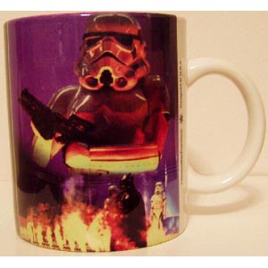 This is a new and unused stoneware ceramic mug from the classic Star Wars movie series. This mug features Imperial Stormtroopers from The Empire Strikes Back on both sides with the name Star Wars in large vertical open letters along the side. It has been stored in a smoke and pet free environment.