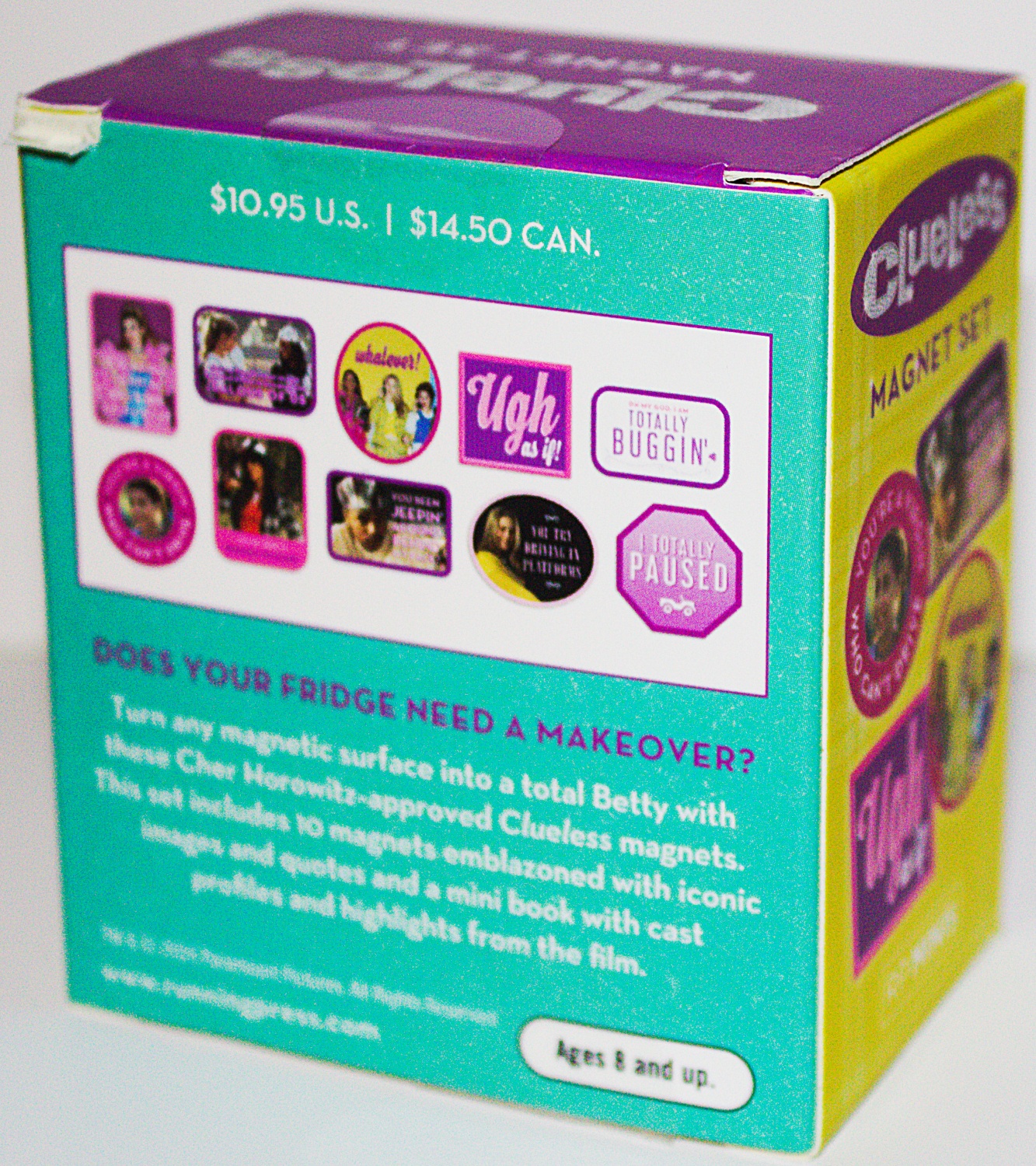 Does your fridge need a makeover? Don’t sweat it. With iconic quotes and images from the beloved movie Clueless, this set of 10 magnets is a throwback to one of the most enduring comedies of all time. 10 full-color magnets featuring Cher, Dionne, Tai, Murray, and your favorite Clueless quotes. There is also 32-page mini book with cast profiles, favorite moments from the film, and full-color photos This is a new, sealed copy that we purchased direct from the publisher and it has been stored in a smoke and pet free environment.