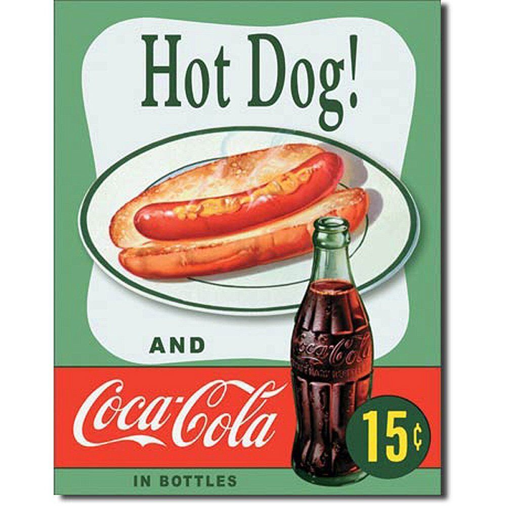 This is an 12.5″ x 16″ heavy grade tin sign that reproduces a classic poster advertising Coca Cola 15 cents and a hot dog. These are produced in the style of the original tin signs that were common in the first half of the 20th century. It is a new, never used sign, complete with pin holes in the corners for easy hanging. These also look very nice framed and have been stored in a smoke and pet free environment.