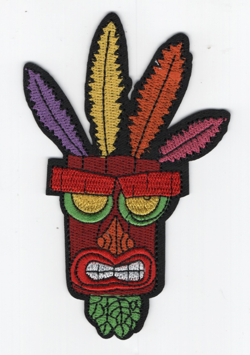 This is a 3″ wide (at the top of the feathers) x 4.75″ high new and unused embroidered patch that reproduces the feathered mask from the Crash Bandicoot Video Game. It is sealed in a protective bag, comes with a glue backing for easy attachment to a cloth surface, and is stored in a smoke and pet free environment.