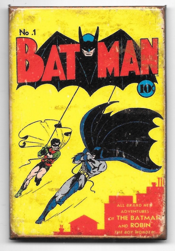 Produced by Desperate Enterprises this is a licensed, 2″ x 3″ magnet featuring the image of Batman comic book #1. It was intentionally made with a distressed rusty edge design to give it an aged look. This is a new, unused magnet stored in a smoke and pet free environment.