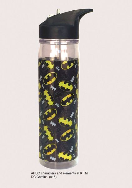 This is an 18 ounce clear plastic water bottle featuring a wrap-around design of the different sizes and colors of the bat chest logo seen on Batman from the DC Comics and movies. Standing 11″ tall, it has a spill proof sport lid with a sippy straw and a new flip-top design. Water bottles are eco-friendly, non-toxic, reusable and recyclable. It also has a hook at the top for attaching to back packs or belts. It is new and unused, perfect for hydrating on the go. Hand wash recommended for this new unused bottle that has been stored in a smoke and pet free environment.