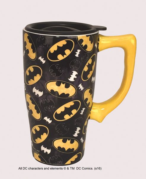 This is a 14 oz ceramic, insulated travel mug featuring a wrap around design of different sizes and colors of Batman’s Bat Logo. This is a new, unused, BPA free travel mug. Hand wash recommended. It has been stored in a smoke and pet free environment.