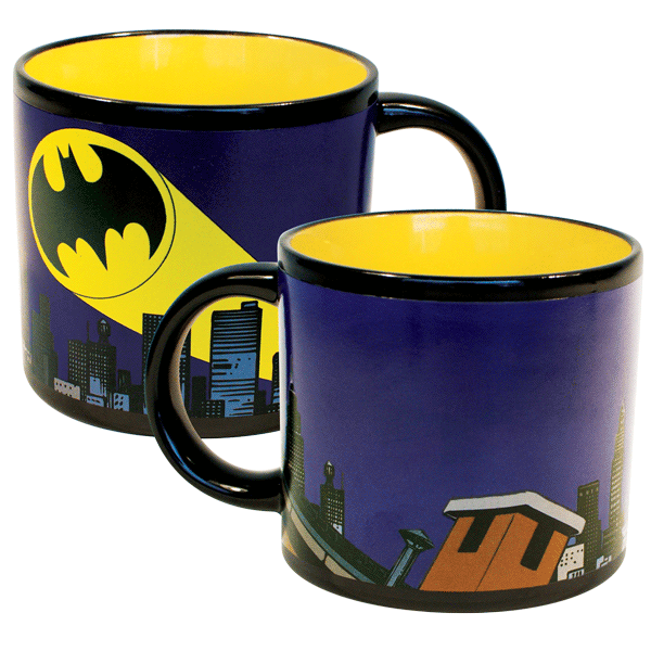 Produced in 2016 this is a 14 ounce ceramic mug that features artwork of the of DC Comics Batman, the skyline of Gotham City and the famous Bat-Signal in a wrap-around design. This is a photo quality design and is Microwave and dishwasher safe. It is new and unused, comes in an illustrated box and is stored in a smoke and pet free environment.
