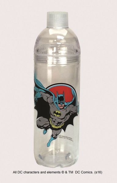 This is a new and unused clear, twist open, 24 oz. acrylic water bottle featuring the figure of Batman in the center as seen in the famous comic book series . The top portion twists off for easy cleaning or to add ice and there is a plastic loop to attach it to a backpack or belt. It is stored in a smoke and pet free environment and is hand wash only.