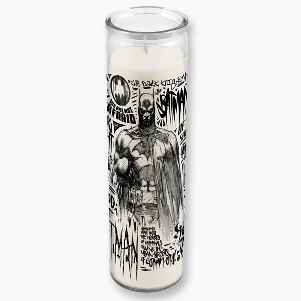 This is an 8″ tall prayer candle inside of an illustrated glass holder featuring the black and white graphitti image of DC Comics Batman.