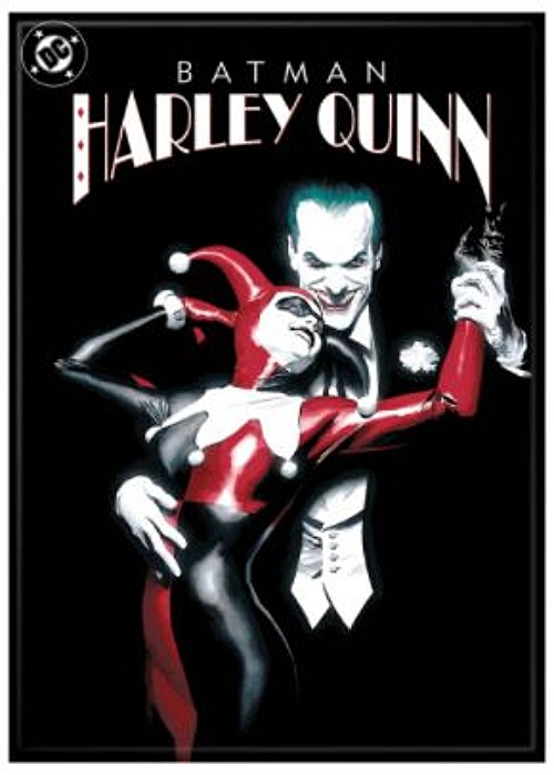 This is a licensed 2.5″ x 3.5″ magnet featuring the comic art images of the classic Harley Quinn being held by the Joker. It is new and unused and stored in a smoke and pet free environment.