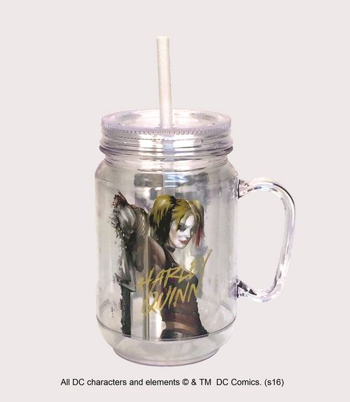 This is an illustrated, 16 ounce, clear, double wall, acrylic mason jar featuring the image of DC Comics Harley Quinn, the nemesis of Batman. It is new, unused, stored in a smoke and pet free environment, BPA free and comes with a lid and straw.