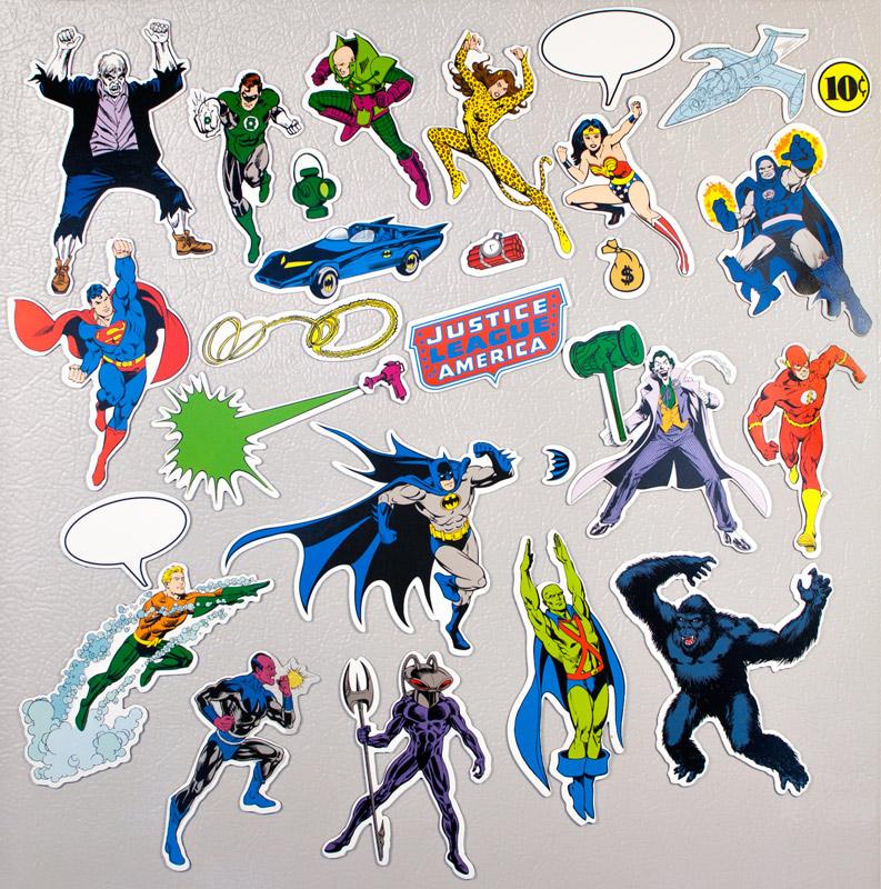 Produced by UPG, this is a magnetic play set featuring images from the world of DC Comics Justice League America. Here they are — Superman, Batman, Wonder Woman, Green Lantern, The Flash, Aquaman, and Martian Manhunter! That’s right, the original members of The Justice League of America join forces again to protect your locker or refrigerator from the evil schemes of The Joker, Sinestro, Lex Luthor, The Cheetah, Gorilla Grodd, and other classic villains who are up to no good! Now law-abiding citizens everywhere can sleep soundly. This is a new, never used, magnet set still sealed in its original shrink wrap and stored in a smoke and pet free environment.