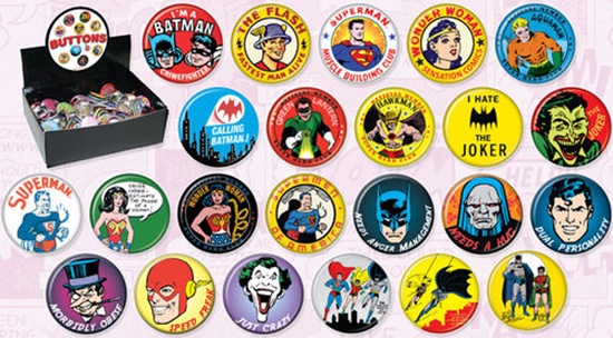Produced by ATA-BOY, this is a licensed set of 144, 1.25″ wide metal buttons featuring multiple retro comic art images of popular DC Comics heroes and villains from the golden and silver age of comics. This is a new, never used, assortment that comes in an illustrated display box and is stored in a smoke and pet free environment.