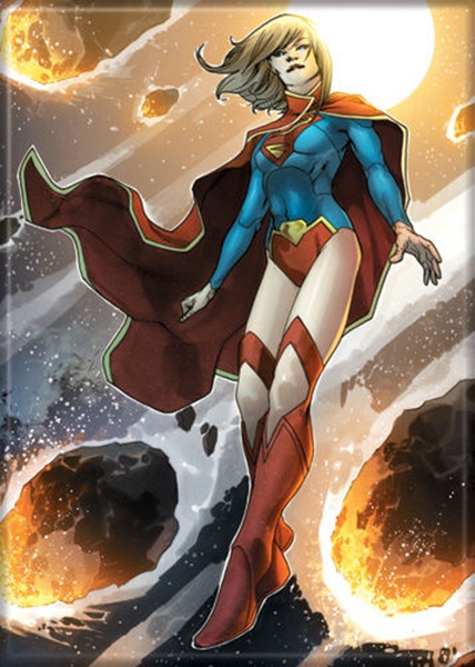 This is a licensed 2.5″ x 3.5″ magnet featuring the comic art image of Supergirl in space from the DC Comics series. This is a new, unused magnet that has been stored in a smoke and pet free environment.