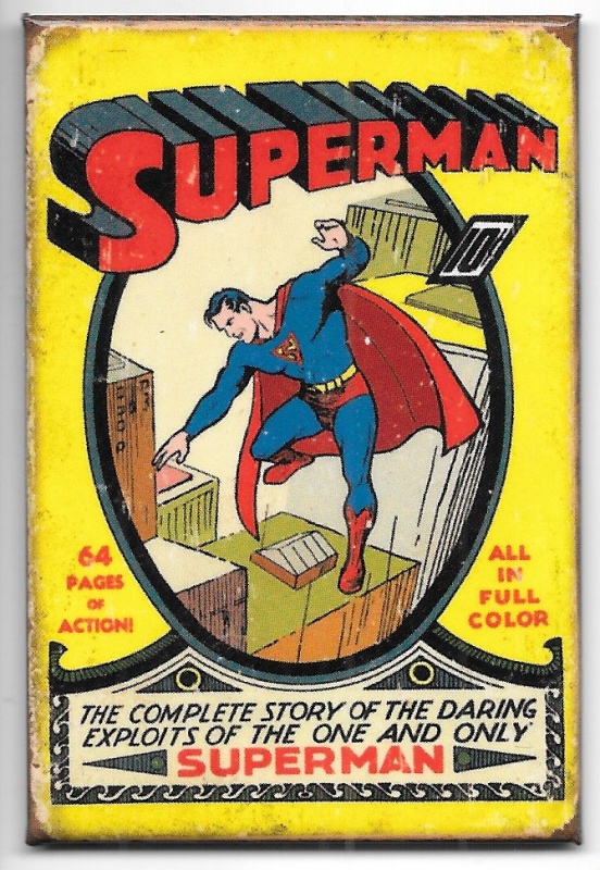 This is a licensed, 2″ x 3″ magnet featuring the image of DC Comics Superman comic book #1 from 1939. This has been intentionally given a rust like appearance around the edges to give it an artificial aged look. This is a new, unused magnet, no longer being made, stored in a smoke and pet free environment.