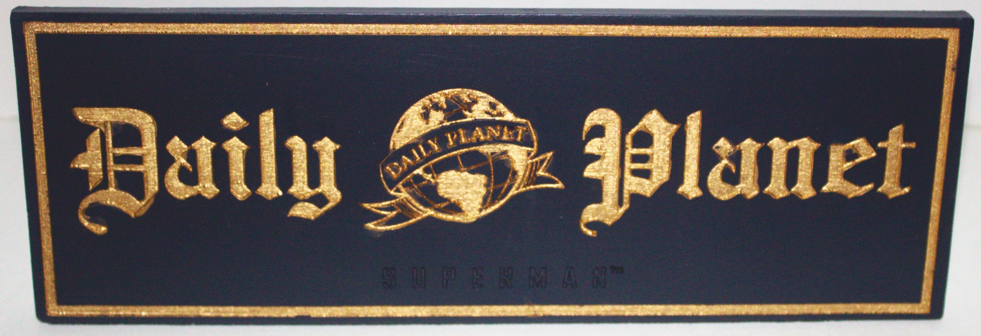 This is a new and unused resin desk sign measuring 8″ x 2.75″ x .375″ with the debossed name and logo of the Daily Planet where Superman works as Clark Kent. It has the Superman name debossed at the bottom. It ships in a protective box and is stored in a smoke and pet free environment.