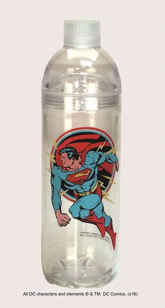 This is a new and unused clear, twist open, 24 oz. acrylic water bottle featuring the figure of Superman in the center as seen in the famous comic book series . The top portion twists off for easy cleaning or to add ice and there is a plastic loop to attach it to a backpack or belt. It is stored in a smoke and pet free environment and is hand wash only.