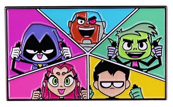 This new, unused 2″ wide licensed enamel metal pin features the group image as seen on the DC Comics animated TV series Teen Titans Go. It has been stored in a smoke and pet free environment.